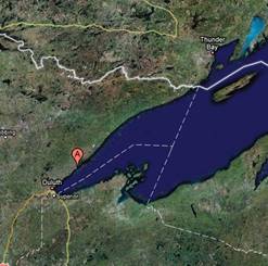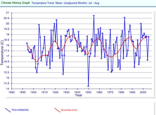 The following graph shows July – August average temperature for Two Harbors, MN the closest long-term station in the NOAA Global Historical Climate Network (location indicated on the adjacent map). The blue line in the graph shows the average July – August temperature for each year since 1891, the red line shows the smoothed trend. Notice the following: