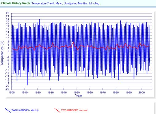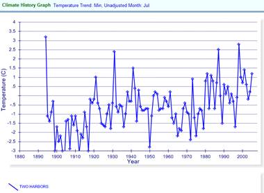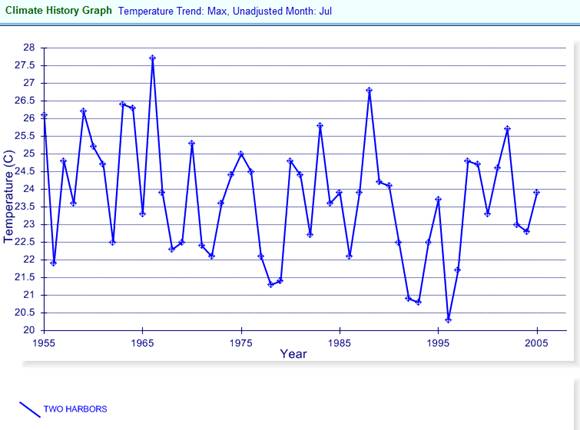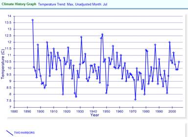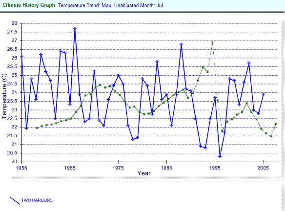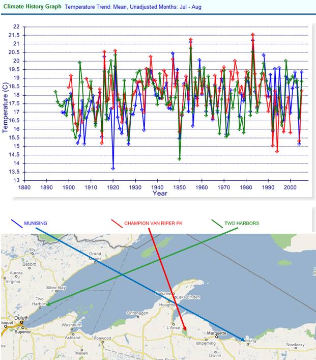 The following graph compares July – August temperatures for Two Harbors, along with two locations on Michigan’s Upper Peninsula. The temperatures are very similar for all three locations. The LAT article stated: “Michigan's sparsely populated Upper Peninsula has about 450, and that population has remained steady“. So why has the UP population remained steady while the MN population has declined, when the temperatures are so similar at these locations? Global warming?