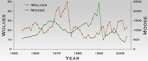 The following figure shows the moose population on Isle Royale since 1958 (green line) [www.isleroyalewolf.org/essays/essays/chronology_files/museum%20history%20of%20wolves%20handout.doc]: “In 2008, 23 wolves and about 650 moose inhabited Isle Royale - close to levels first observed 50 years ago. … In 1980, wolves were abundant and moose had been on the decline for the better part of a decade. The next two years were dramatic. Wolves plummeted from 50 to 14. Canine parvovirus, a disease brought to Isle Royale by a domestic dog, was largely to blame for the decline. While predation was low during the late 1980s and