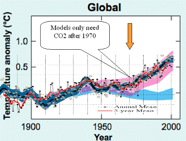 The IPCC does not make the claims stated in the Archaeology magazine introduction. First of all, the IPCC claims that CO2 affects temperatures only since 1970. The following figure is from the IPCC AR4, with global temperatures superimposed. It shows the output of multiple runs of multiple climate models: blue band – using only natural climate forcings, and pink band – including anthropogenic CO2. One thing that is clear is that the models only require the inclusion of CO2 after 1970. In other words, according to the IPCC, warming prior to 1970 can be explained by natural causes. This is an important point since many people are mislead into thinking that the official IPCC position attributes the 20th century warming to CO2, which is not the case.
