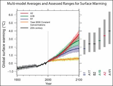 Secondly, the projections of future warming under various scenarios have as the highest probability case, a warming of less than 2 degrees over the next century. The following figure is from the IPCC AR4 showing outputs of climate models for various future scenarios. It does not show the probability levels, but even at its most extreme case comes nowhere near the 10 degrees as claimed in the article.