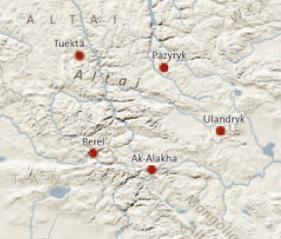 The following images show: location of Altai Mountains (left) and location of Altay temperature station (center, marked with A on red symbol) and major kurgan sites (right).