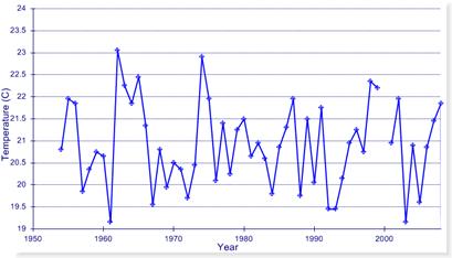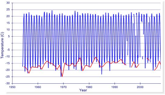 The following figure shows the monthly mean temperature (blue) along with the January mean temperature (red). There is no trend evident in either the summer or winter temperatures. Poor data recording is evident from the mid-1990s to the early 2000s.