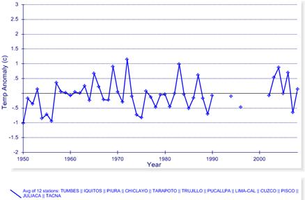 The following figure shows the annual mean temperature for the average of all 12 “long-term” stations in Peru (in this case unfortunately not actually long-term, but since 1950) stations in the NOAA GHCN database. No warming trend.