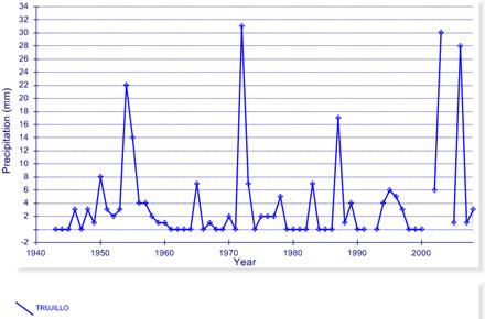 The article mentions Chan Chan as an archaeological site threatened by erosion due to precipitation. Chan Chan is 5 km from Trujillo. Unfortunately there is a lot of missing data in the NOAA GHCN records for Peruvian stations. The following figure shows total annual precipitation for Trujillo – the closest station to Chan Chan.