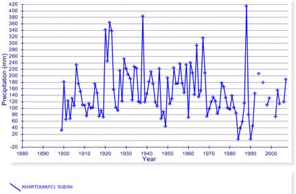 Khartoum is the closest station in the NOAA GHCN database (and the only one with long-term data). The following figures show the average annual temperature in Khartoum (left) and total annual precipitation (right). The area has experienced warming over the last few decades as well as low precipitation, although the precipitation is recovering since the 1980s.
