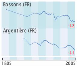 The following figures show glacier recession for several glaciers in the Austrian Alps (left) and French Alps (right) [http://www.grid.unep.ch/glaciers/pdfs/6_5.pdf] showing fluctuating glacial retreat since the 1800s.