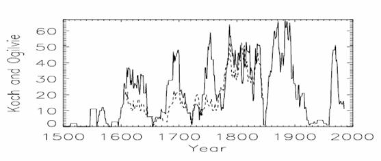 The following figure shows the Icelandic sea ice index from a 2005 report by the Danish Meteorological Institute (“Multi-decadal variation of the East Greenland Sea-Ice Extent: AD 1500-2000”) [http://www.dmi.dk/dmi/sr05-02.pdf].