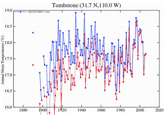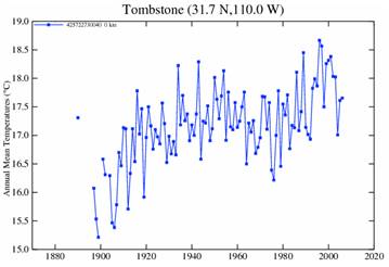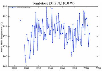 Hansen is responsible for the GISS surface temperature analysis from station data [the results of which are available at http://data.giss.nasa.gov/gistemp/station_data/]. The analysis includes adjustments to temperature data to introduce artificial warming. As an example, the following figure shows the Tombstone historical data (left) and after adjustment (right) – notice the different y-axis scale.