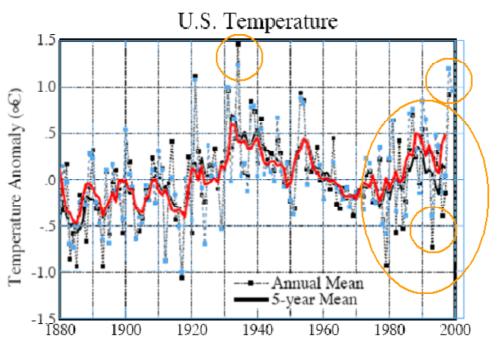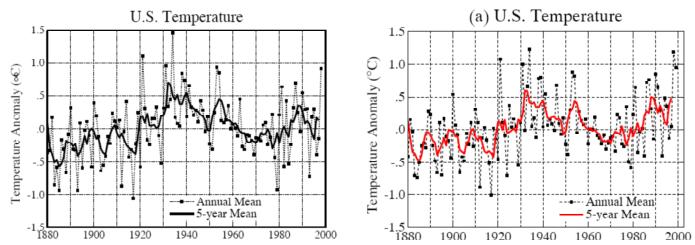 Hansen periodically revises the adjustment methods used. The following two figures show the U.S. temperature anomalies up to 1999. The graph on the left was produced in 1999 (Hansen et al 1999 [http://pubs.giss.nasa.gov/docs/1999/1999_Hansen_etal.pdf ]); the graph on the right was produced in 2001 (Hansen et al 2001 [http://pubs.giss.nasa.gov/docs/2001/2001_Hansen_etal.pdf]). They are from the same raw data – the only difference is that the adjustment method was changed in 2001. The next figure compares the graphs (1999 black, 2001 blue), showing how an increase in temperature trend was achieved simply by changing the method of adjusting the data. Some of the major changes are highlighted in this figure – the decreases in the 1930s and the increases in the 1980s and 1990s. So was 1934 or 1998 the warmest year in the U.S.? It depends on the adjustments.