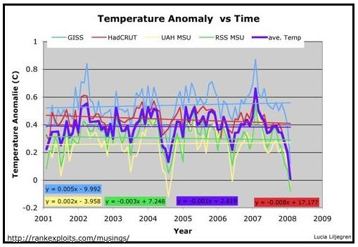 The net result is that the GISS dataset consistently shows more warming than other data sets. The following figure compares global average temperature anomalies for the two main surface temperature data sets (GISS – blue - and HadCRUT) and the two satellite data sets (UAH and RSS) from 2001 to early 2008. The GISS data set shows warming whereas the others do not.