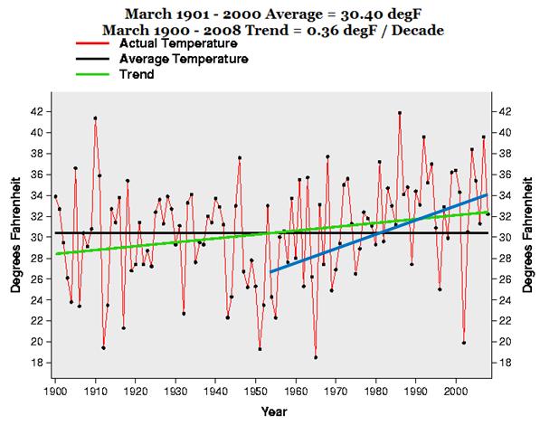An example of their science: “An analysis by Climate Central shows that average March temperatures have risen over 7°F since the 1950s.” [http://www.climatecentral.org/video/montana-trout-drought/]. While this is a factual statement, it is selective in starting with the coldest decade in the last century. The following figure from the NOAA National Climatic Data Center [http://www.ncdc.noaa.gov/oa/climate/research/cag3/mt.html] shows the 1950 – 2008 trend line in blue and the 1900 to 2008 trend line in green for March temperatures in Montana.