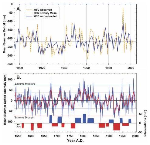 A 2006 paper by scientists at Montana State University and the U.S. Geological Survey (Pederson, G.T., S.T. Gray, D,B. Fagre, and L.J. Graumlich. 2006. “Long-Duration Drought Variability and Impacts on Ecosystem Services: A Case Study from Glacier National Park, Montana”. Earth Interactions, 10, Paper No. 4.), examined drought history for Glacier National Park and the surrounding area, using tree ring proxies. The following figure is from their paper. The top of the two plots shows the observed and reconstructed mean summer soil moisture deficit over the past century, while the lower plot shows the reconstructed drought levels back to 1540. There is no correlation between drought and CO2.