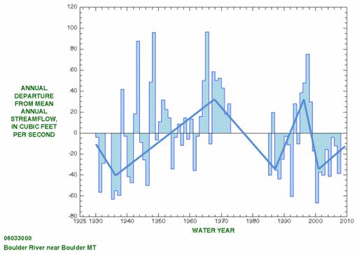 The Climate Central report on Montana mentions the Boulder River as a trout stream threatened by global warming. The following figure shows the stream flow in Boulder River for the historical data.