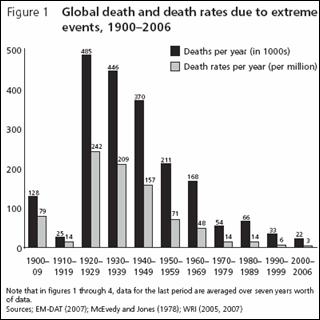 His paper mentions various extreme events of the recent past, for example, “heat-waves in the summer of 1995 claimed 1,100 lives (14), including 525 in Chicago during a single 3-week period”. However, a study by Indur Goklany published in 2007 (“Death and Death Rates Due to Extreme Weather Events -- Global and U.S. Trends, 1900–2006” [http://www.csccc.info/reports/report_23.pdf]) shows that even during the period of 1970 – 2006 (the period in which the IPCC says has experienced anthropogenic global warming), deaths due to extreme weather continue to decline. The following figure is from that paper. Golkany’s paper shows that there are twice as many deaths per year in the U.S. due to extreme cold than to extreme heat, so Diffenbaugh’s scenario would likely be a positive improvement.