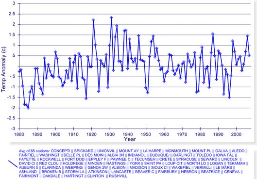 The following figure shows the annual temperature anomaly – average of all stations in the NOAA Global Historical Climate Network in the approximate corn growing area in the United States. Most of the warming took place in the late 1800s – 1930s, which the IPCC says was due to natural factors.