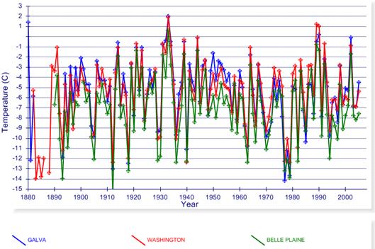 The following figure shows January temperatures for three stations in the corn growing area of Iowa. Diffenbaugh says the corn pests will expand due to warmer winter temperatures not killing them. Where’s the warming? (It’s in the models – not the real world.)