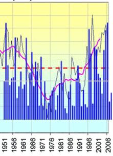 The following figure shows the annual number of strong tornadoes for the period of 1950 to 2006. The number of strong tornadoes has been decreasing since the 1960’s.