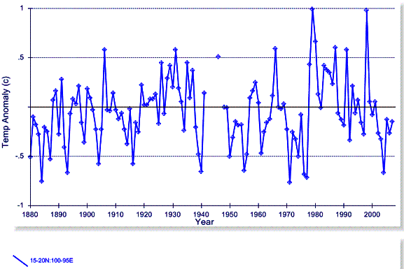 The following figure shows the Hadley Climate Research Unit temperature anomaly data for the 5x5 degree grid encompassing the area hit by the cyclone. Since the 1930s peak, the temperatures declined into the late 1970s. In 1977-78 the pacific climate shift warmed the area and it has been cooling since. Except for 1998 (due to the strong El Nino that year) recent temperatures have been similar to 100 years ago.