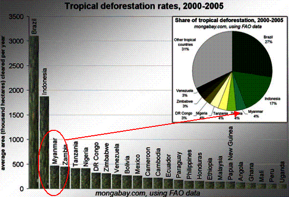 According to the UN FAO, 20 percent of the world’s mangrove forests have been destroyed since 1980 [http://www.fao.org/newsroom/en/news/2008/1000776/index.html]. Myanmar has the third-largest rate of tropical deforestation in the world, behind Brazil and Indonesia, as shown in the following figure from Mongabay.com. The use of wood as fuel is the main reason for deforestation. The UNEP country profile states: “Deforestation in Myanmar, unlike in some other developing countries is not the result of commercial extraction of timber but due to shifting cultivation, fuel-wood problem. … about 81 percent of energy consumption depends upon biomass including woodfuel and agricultural residues, of which consumption of woodfuel account for 84.1 percent. Few rural homes in Myanmar have supply of gas or electricity. Thus there is heavy reliance on fuelwood resulting in depletion of forest cover” [http://countryprofiles.unep.org/profiles/MM/profile/state-of-the-environment/referencemanual-all-pages]