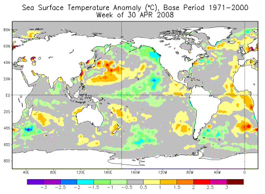 Sea surface temperatures (SST) vary significantly over relatively short periods of time. The following figure shows the SST anomalies for the week of April 30 when the storm started developing [http://www.ncdc.noaa.gov/img/climate/research/sst/wksst.20080430.gif]. The next figure shows a close up of the Bay of Bengal area.