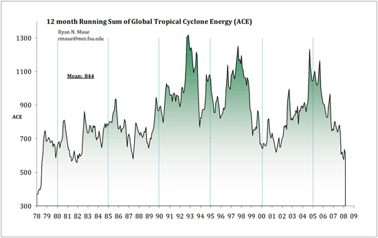 The following figure shows the running 12-month sum of global tropical cyclone energy from 1978 to 2008. Recent years have seen decreasing ACE with current levels similar to the late 970s. [http://www.coaps.fsu.edu/~maue/tropical/]