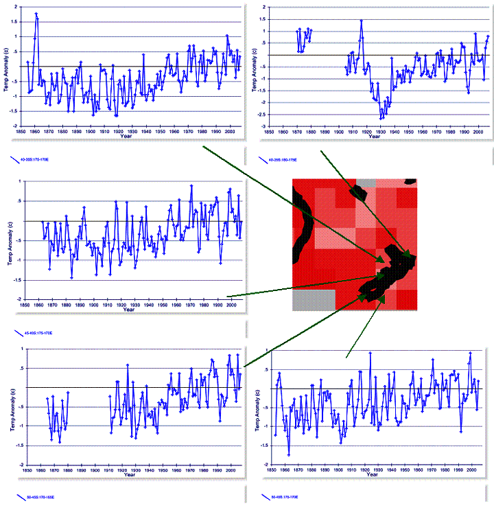 The following figure shows the HadCRU temperature anomaly data for each of the 5x5 degree grids encompassing temperature stations in New Zealand.