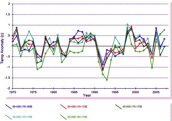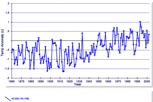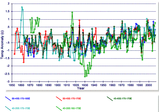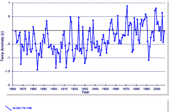 The following figure shows the HadCRU temperature anomaly graph for the 35-40 S / 170-175 E grid.