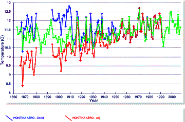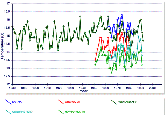 None of the stations in New Zealand exhibit warming in the raw data – only in the adjusted data. None of the stations show warming in the last 4 decades even in the adjusted data. Global warming? – not in this part of the globe.