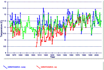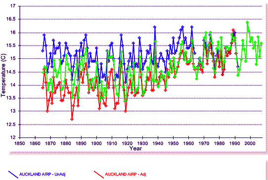 The following figure superimposes the HadCRU grid on the GHCN Auckland data – the raw Auckland data is in blue, the NOAA adjusted Auckland data is in red and the HadCRU grid is in green. This gives an indication of the adjustments made by HadCRU – not as extreme as NOAA, but still inducing warming.