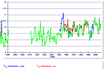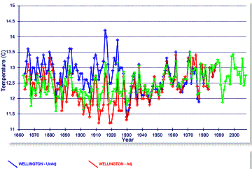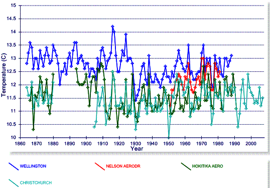 In the above figure, the temperature plots are created from HadCRU CRUTEM3 data at www.appinsys.com/GlobalWarming/Climate.aspx and the “map” of New Zealand is from the IPCC AR4, Figure 9.6 indicating warming from 1901 to 2005.