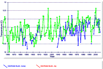 Comparing the GHCN Auckland data with the HadCRU grid shown previously – why does the HadCRU grid show warming when the only long-term station in the grid does not? -- adjustments.