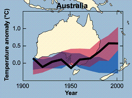 The following figure is from the IPCC AR4 (FAQ 9.2 Fig.1) and is the closest to New Zealand. The blue band shows the range of temperature outputs from the climate models including only natural forcings, while the pink band shows the range of temperatures from the models including anthropogenic CO2. It shows that the models deviate in the 1970s – prior to that there is significant overlap between the two sets. In other words, according to the IPCC, anthropogenic CO2 is only a factor in explaining temperatures after 1970.
