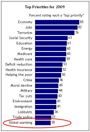 What do people think? According to a national survey by the Pew Research Center for the People & the Press, conducted Jan. 7-11 [http://people-press.org/report/485/economy-top-policy-priority], global warming is the least of the concerns of the American people. Keep in mind that the Pew Charitable Trusts runs the Pew Center on Global Climate Change (whose slogan is “Working Together…Because Climate Change is Serious Business”) and the Pew Campaign on Global Warming (which promotes “mandatory limits on greenhouse gas emissions” and “national climate policies that reduce greenhouse gas emissions across all economic sectors”) [http://www.pewtrusts.org/our_work_category.aspx?id=112] The following figure is from the Pew survey mentioned above. It shows that global warming is at the bottom of the list of concerns. If Pew wasn’t promoting global warming alarmist fears it wouldn’t even be that high up on the list.