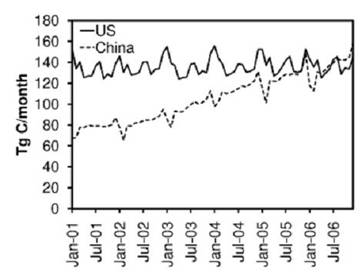 A study published in 2008 reports that China became the largest emitter of CO2 from fossil fuel combustion and cement production in 2006. (Gregg, J. S., R. J. Andres, and G. Marland, “China: Emissions pattern of the world leader in CO2 emissions from fossil fuel consumption and cement production”, Geophysical Research Letters 35, 2008) [http://www.agu.org/pubs/crossref/2008/2007GL032887.shtml]. The following figure is from that study and compares the monthly carbon emissions for the US and China for 2001 – 2007. The study states: “the annual emission rate in the US has remained relatively stable between 2001–2006 while the emission rate in China has more than doubled.”