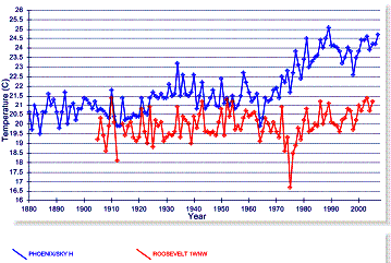 The next graph below left provides a comparison of Sky Harbor, Roosevelt and Childs in terms of annual average maximum temperature (which occurs during daytime), while the graph below right compares the annual average minimum temperatures (which occurs during nighttime). The urban heat effect is very noticeable.