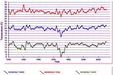 The next graph below left provides a comparison of Sky Harbor to Roosevelt -- the nearest rural station with current data. For Roosevelt the current warming is within the historical range of temperatures. The graph below right compares the annual mean with the annual average minimum and maximum temperatures for Roosevelt. Unlike the urban Sky Harbor station, the rural Roosevelt station does not exhibit nighttime warming.