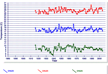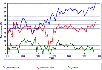 The next graph below left provides a comparison of Sky Harbor, Roosevelt and Childs -- another rural station with current data north of Phoenix. Childs is exhibiting a cooling trend over the last 50 years. The graph below right compares the annual mean with the annual average minimum and maximum temperatures. Unlike the urban Sky Harbor station, the rural Childs station exhibits nighttime cooling.