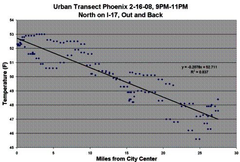 Warren Meyer and his son drove I-17 north from Phoenix measuring temperatures from the city center out to the rural area on cloudless nights when the wind was less than 5 mph. The following figure shows how the temperature decreases with distance from the city center [http://www.climate-skeptic.com/2008/02/measureing-the.html].