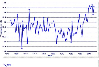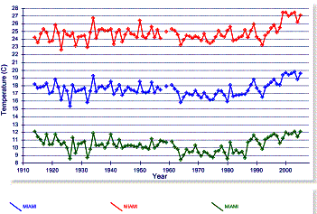 East of Phoenix there is a rural station that exhibits recent warming: Miami, AZ. The following graphs show the mean annual temperature (left) and the average annual mean (blue), maximum (red) and minimum (green) temperature (right).