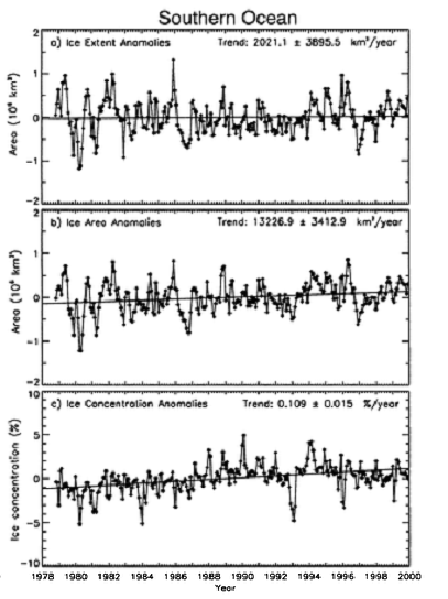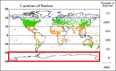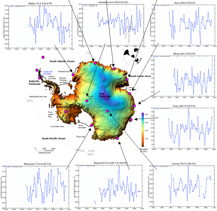The IPCC states in the AR4 report on the physical science [http://ipcc-wg1.ucar.edu/wg1/Report/AR4WG1_Pub_Ch09.pdf] “The model-estimated responses to these external factors are detectable in the 20th-century climate globally and in each individual continent except Antarctica, where there are insufficient observations.” But actually there are sufficient observations – Antarctica just doesn’t fit the theory.