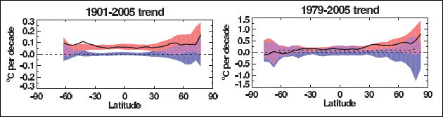 A report by the University Centre in Svalbard (UNIS) in Norway (“Antarctic temperature changes during the observational period”) [http://www.unis.no/research/geology/Geo_research/Ole/AntarcticTemperatureChanges.htm] states that “all GCMs indicate that the Polar Regions should experience a much larger warming than would occur in lower latitudes due to two basic greenhouse mechanisms. Firstly, atmospheric carbon dioxide (CO2) has its greatest absorption of infrared radiation (IR) at sub-zero temperatures, as its absorption bands lie in the 12-16 micron wavelength band, corresponding to the wavelength of strongest IR emission from ice and snow. Secondly, water vapor, sharing overlapping absorption bands with CO2, is only present in limited amounts in the polar atmosphere due to low temperatures, allowing CO2 to exert a much greater influence than would be possible in warmer and moister air masses at lower latitudes. An important enhanced greenhouse signal would thus be strong warming in the polar and sub-polar regions and less warming at lower latitudes.”