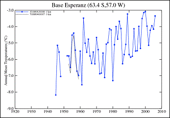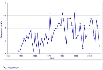 A study of the Marion Island environment published in the journal Climatic Change (“Climate Change in the Sub-Antarctic: An Illustration from Marion Island” by V.R. Smith Department of Botany, University of Stellenbosch, South Africa, [http://www.springerlink.com/content/m71754124t3737q0/]) stated that: “between 1969 and 1999 annual mean surface air temperature at the island increased by 1.2 ° C. The interannual variability in annual total sunshine hours was large, and irregular, but a significant proportion of that variability could be ascribed to an average increase of 3.3 hours each year between 1951 and 1999. Hours of sunshine increased for all months in that period.”