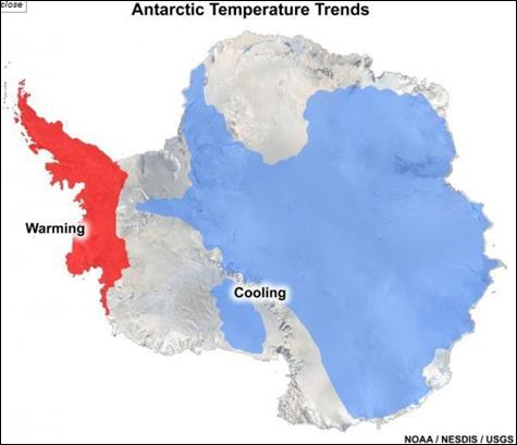 The following figure shows the approximate boundaries of areas that have warmed or cooled over the past 35 years. [http://www.sciencedaily.com/releases/2008/05/080507132855.htm] The Antarctic Peninsula (West Antarctica) goes through large variations in temperature. “during a major El Niño event from 1939 to 1942, temperatures in West Antarctica rose by about 6 to 10 degrees F (3-6 degrees C), and then dropped by an estimated 9 to 13 degrees F (5-7 degrees C) over the next two years.” [http://www.sciencedaily.com/releases/2008/08/080812160619.htm]
