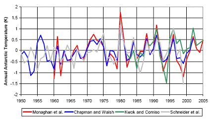 The following figure providing four temperature trends for Antarctica is from “Advances in describing recent Antarctic climate variability” by Andrew J. Monaghan and David H. Bromwich (Polar Meteorology Group and Atmospheric Sciences Program, Ohio State University, Submitted to Bulletin of the American Meteorological Society, August 2007), which states “None of the trends are statistically significant from zero.”