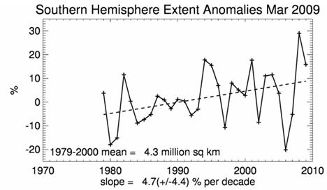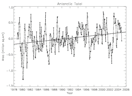 An article in Science Daily about a study reported in the Journal of Geophysical Research (Oceans) [http://www.sciencedaily.com/releases/2005/06/050630064726.htm] (“Warmer Air May Cause Increased Antarctic Sea Ice Cover”, 2005) that used satellite observations from NASA's Special Sensor Microwave/Imager to assess snow depth on sea ice. The article states that “increases in precipitation due to warmer air temperatures from greenhouse gas emissions may actually increase sea ice volume in the Antarctic's Southern Ocean. This finding from a new study adds evidence of potential asymmetry between the two poles and may be an indication that climate change processes may have varying impacts on different areas of the globe.”