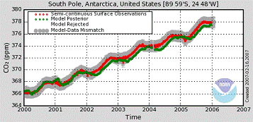 The NOAA Earth System Research Laboratory – Global Monitoring Division maintains a network of CO2 monitoring stations around the world. [http://www.esrl.noaa.gov/gmd/aggi/]. The following plots compare the recent CO2 trends at Palmer Station (on the Antarctic Peninsula) and the South Pole. There is virtually no difference between the two locations, although there is a substantial temperature difference as seen in the previous temperature trend graphs. In fact the CO2 measurements at all the world’s stations show a similar trend, whereas the temperatures do not.