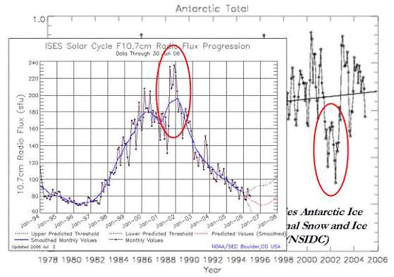 The following figure shows total Antarctic ice coverage for 1978 to 2006. The second figure compares that with the solar radio flux. [http://icecap.us/images/uploads/A_NEW_RECORD_FOR_ANTARCTIC_ICE_EXTENT.doc] The circled area is the 2002 collapse of the Larsen ice sheet. As can be seen, this event is correlated with solar input not with the CO2 variations shown above.