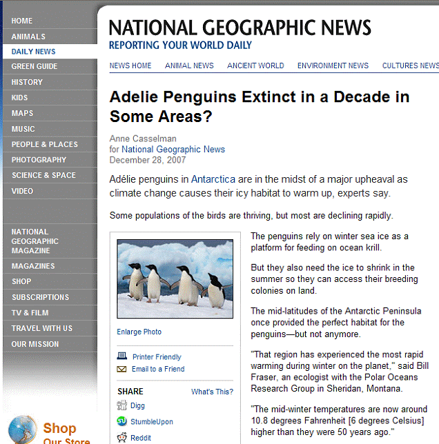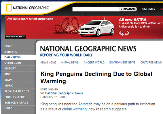 Penguins are often portrayed as succumbing to global warming. National Geographic is a major promoter of doomsday reporting, unsupported by actual facts: