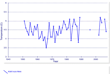 Very few temperature stations exist in the area of these sub-Antarctic islands. The following two figures show the only stations with more than 50 years of data. Port-aux-France (left) is on an island 300 miles from Heard Island. Macquerie Island is shown on the right.